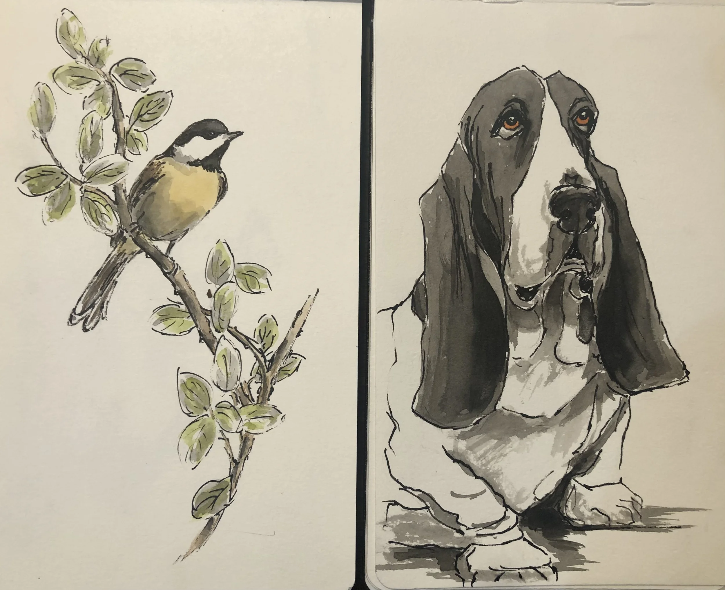 Event Description: Demonstration of a variety of ways to use Sumi ink, a bamboo pen, and watercolor to depict different subjects