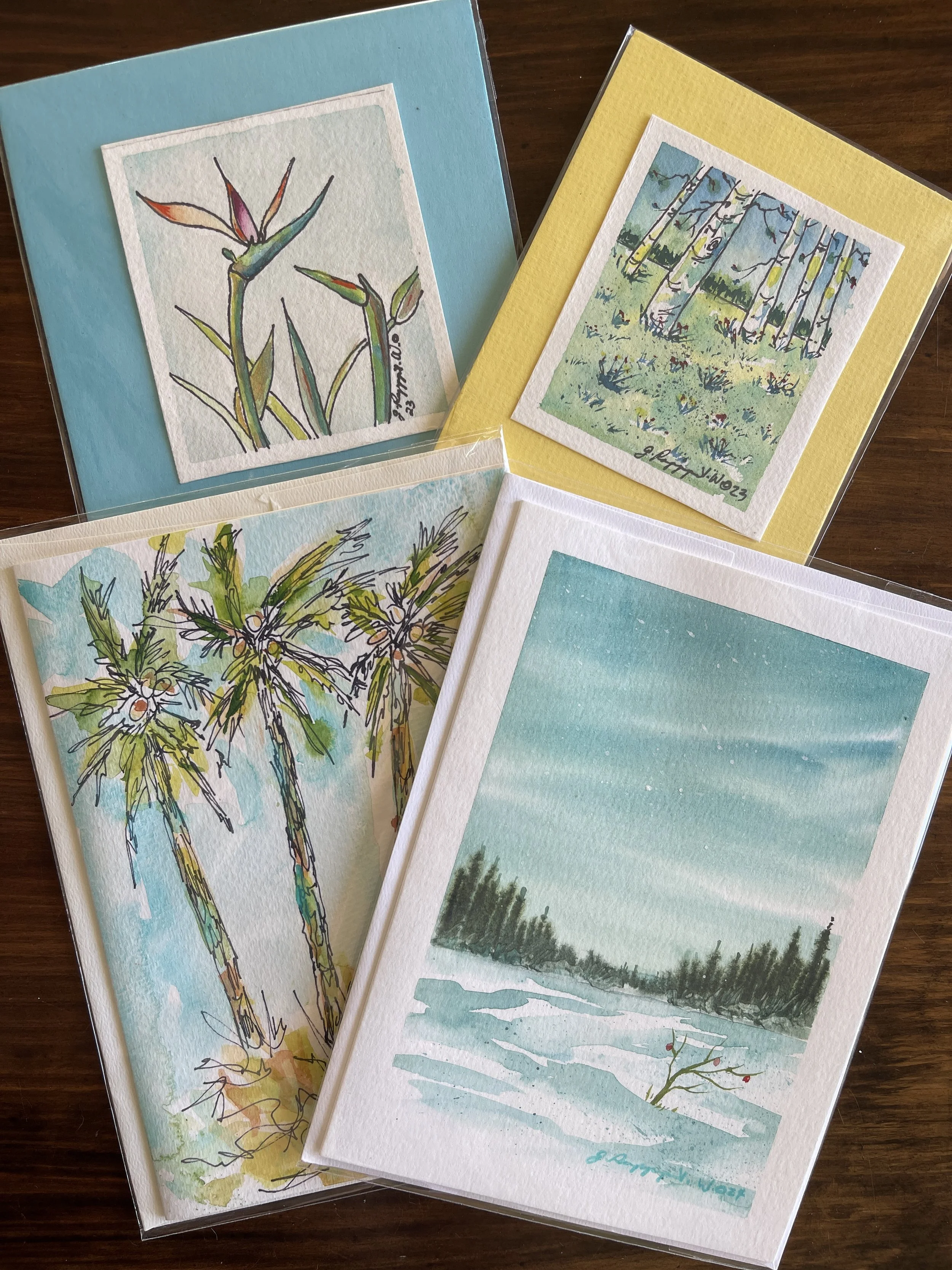 Description: Multiple greeting cards, small paintings, and progress on a mixed media painting