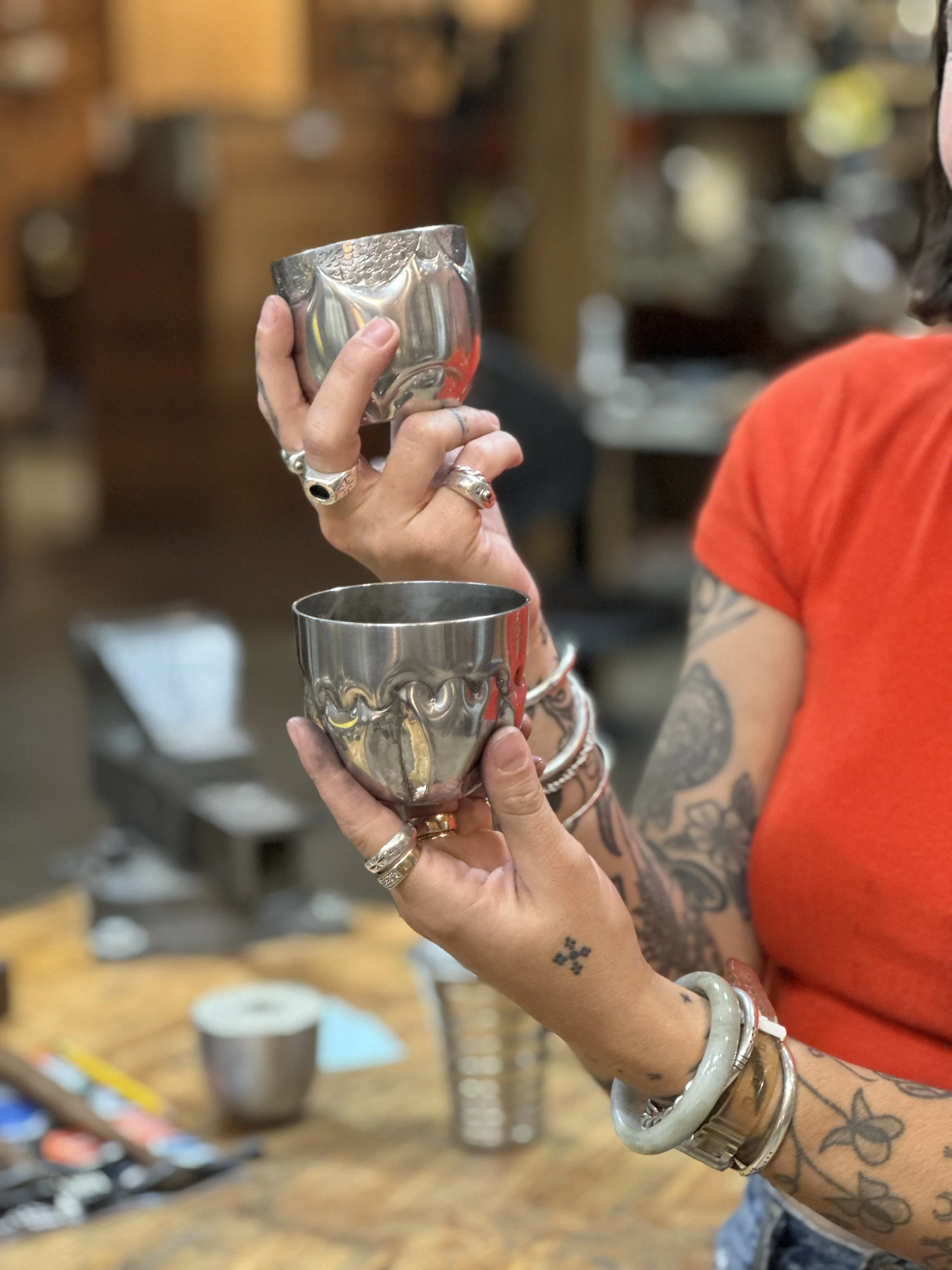 Description: Demonstrating hand forging, chasing, raising, jewelry fabrication and other techniques used in the artist’s silversmithing studio and student workshops.
