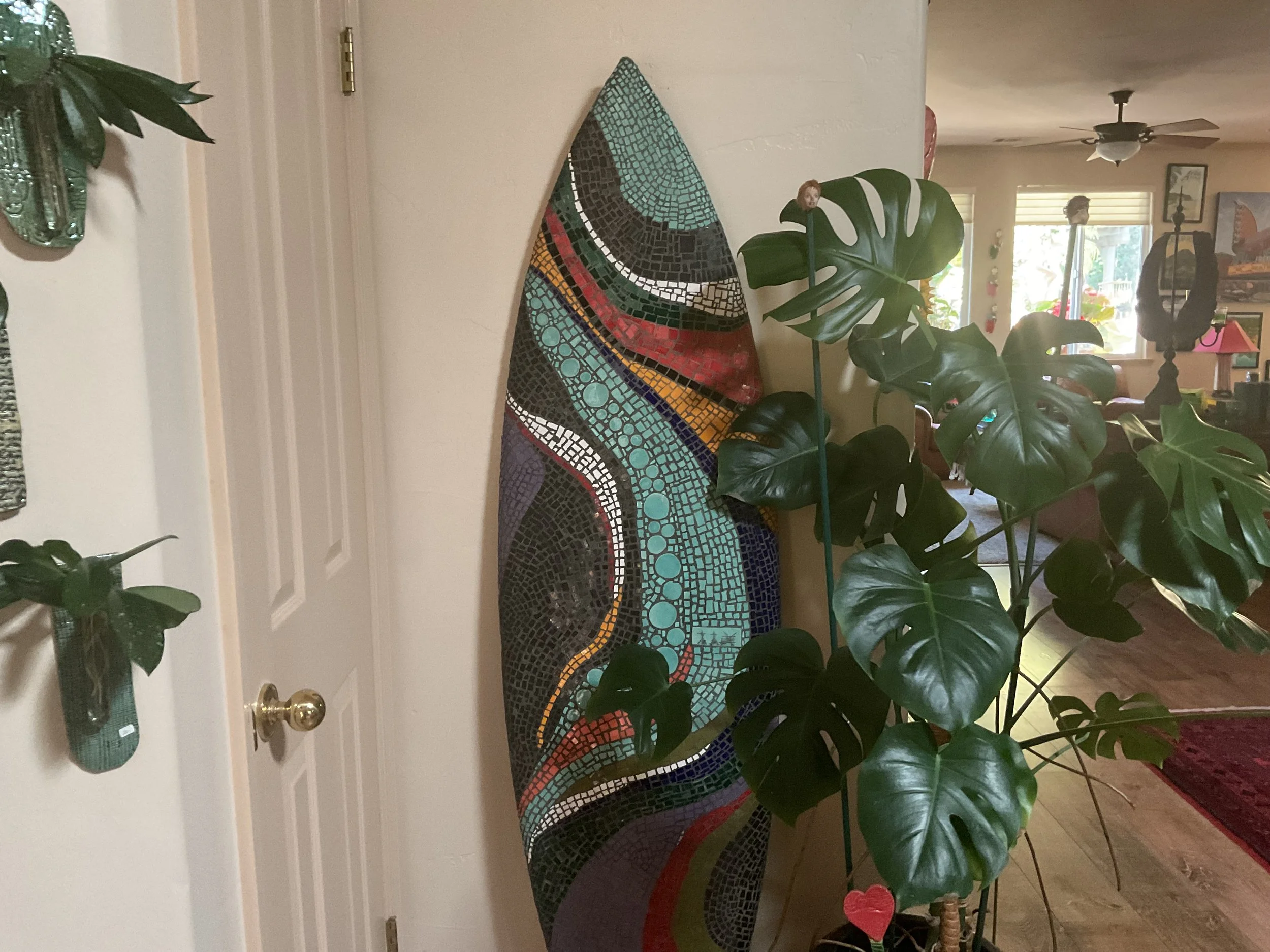 Description: The artist will be cutting tile for a mosaic surfboard.